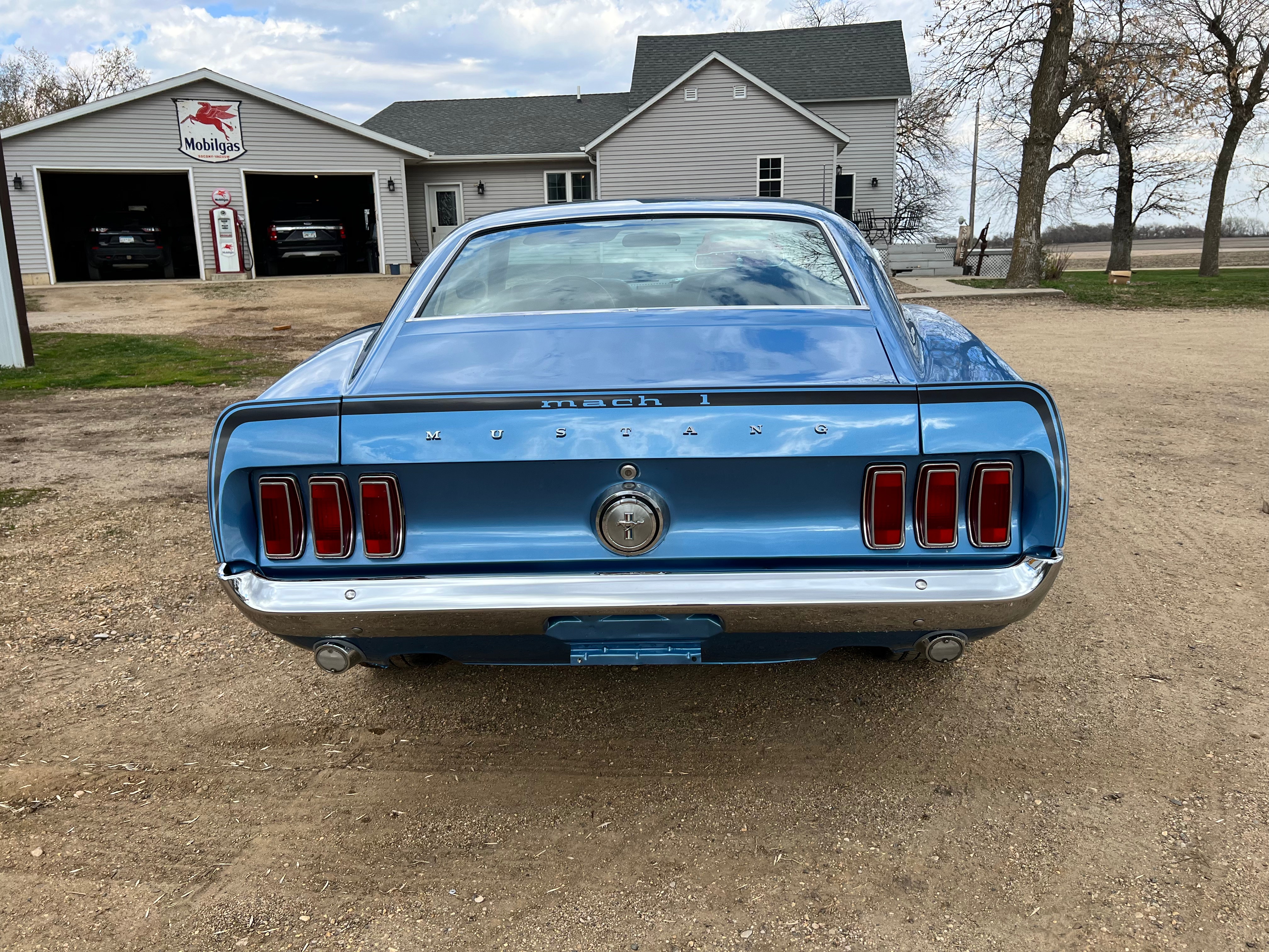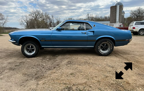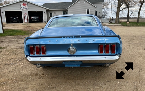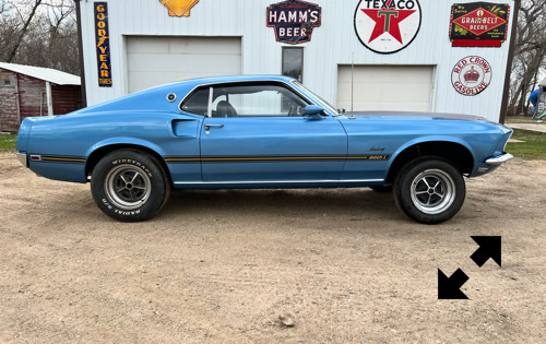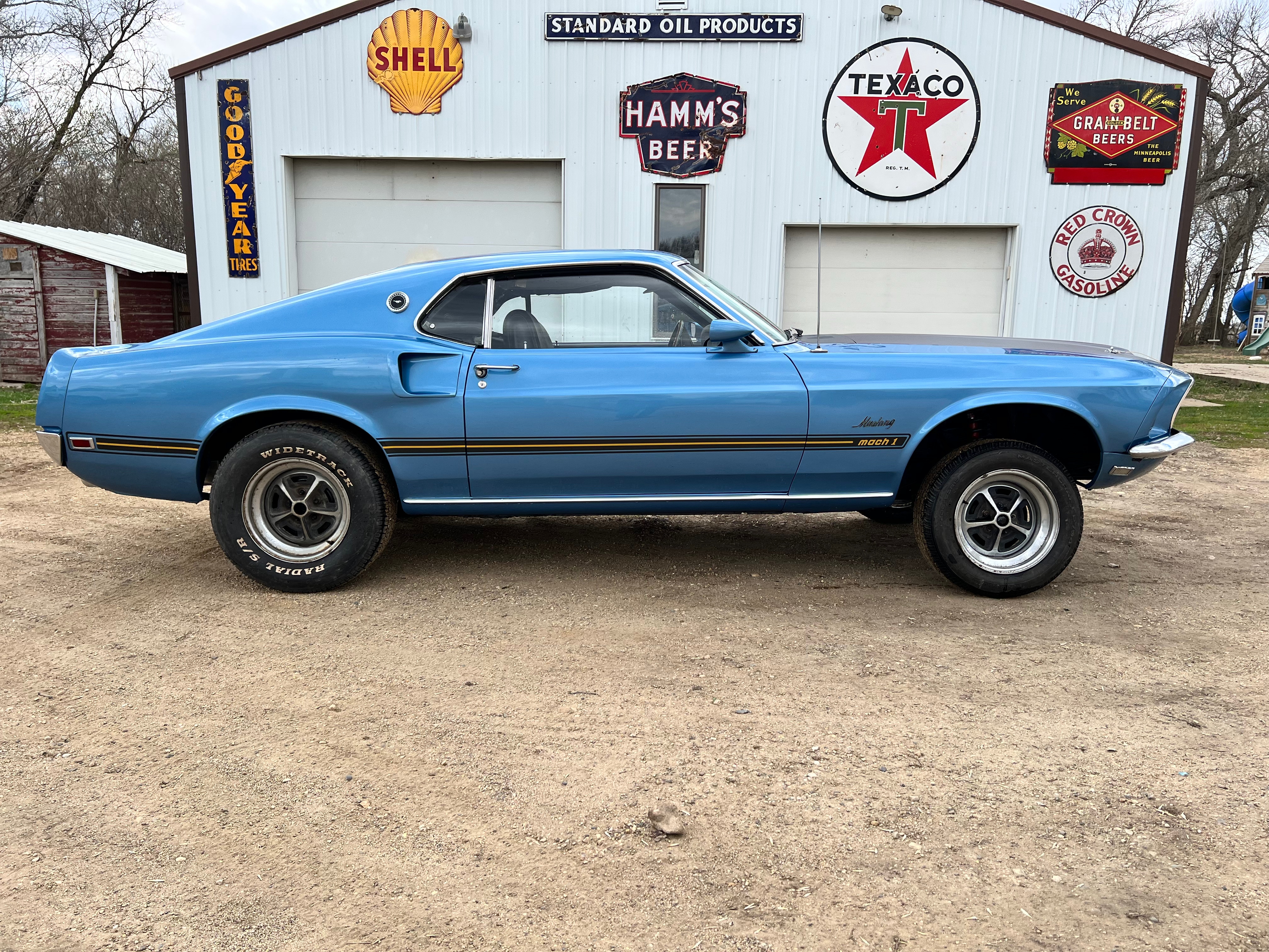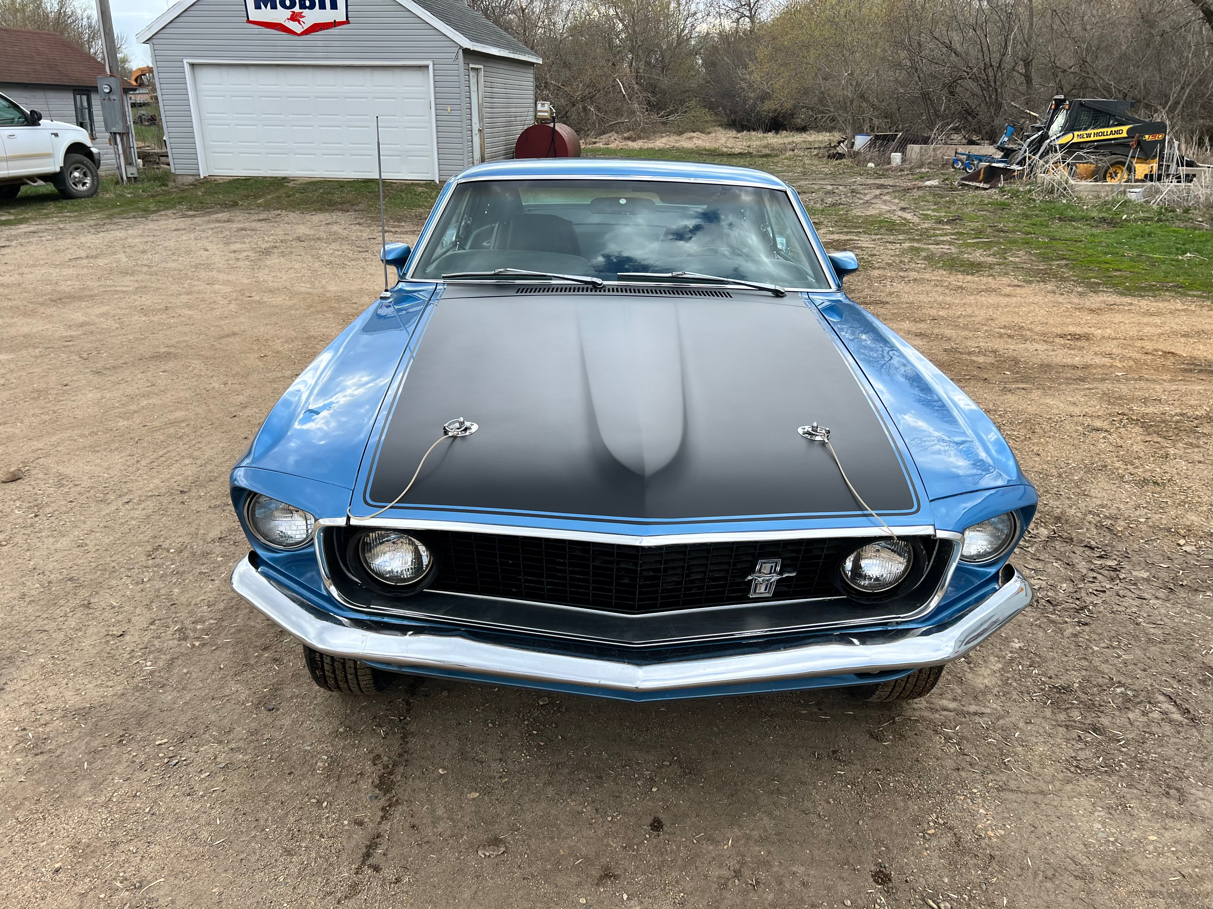 This has been on a rotisserie and all metal work done. It has original Ford Fenders with no patches, Original Rear Quarters but they have been patched on the bottoms, Original Doors that have been patched, an original Ford Hood that hasn't been cut for the Shaker so the new owner can decide which way they want to finish it, the Floors had a couple minor patches, the the front rails and torque boxes are original with no work done to them, it did have rear rail extensions & trunk drop pans replaced. The underside of the car has been sprayed with bedliner to seal it and prevent any future rust. This was a pretty solid car before the restoration was started. It was painted in its original Winter Blue color.